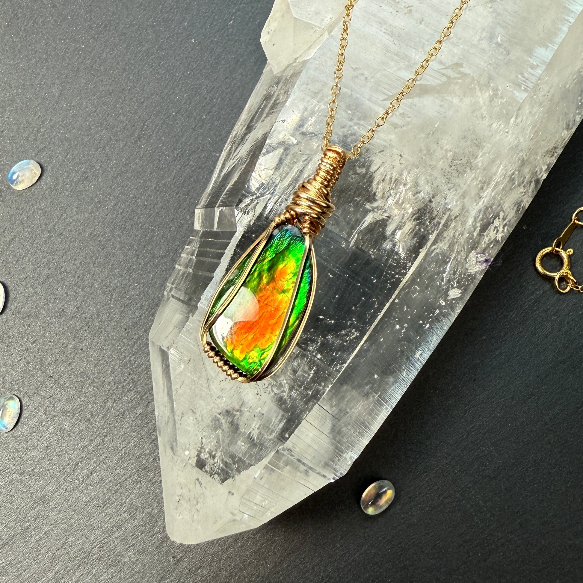 Natural Ammolite handmade pendant, in 14k gold filled.