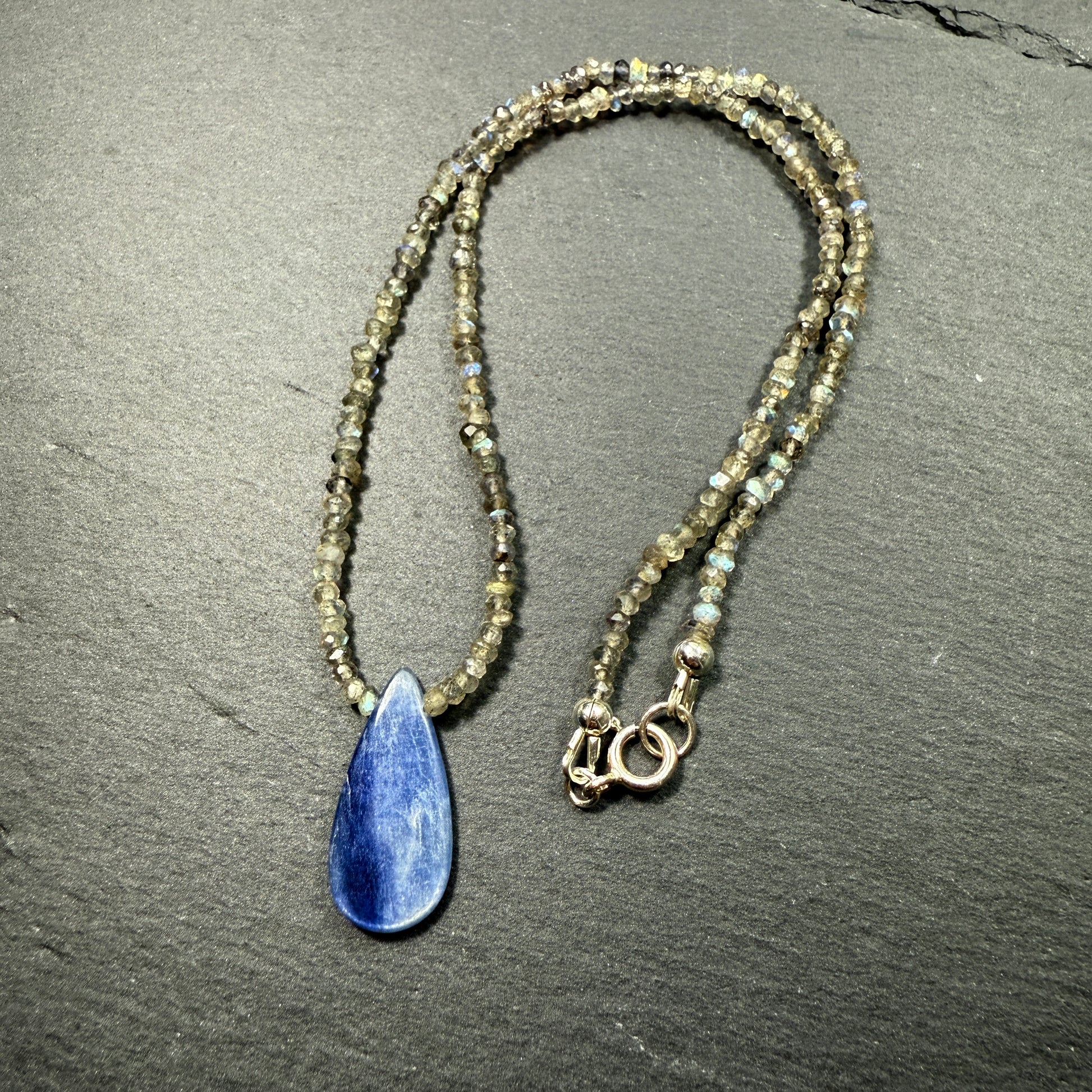 This Gemstone Necklace features Blue Kyanite and Labradorite beads with sterling silver.