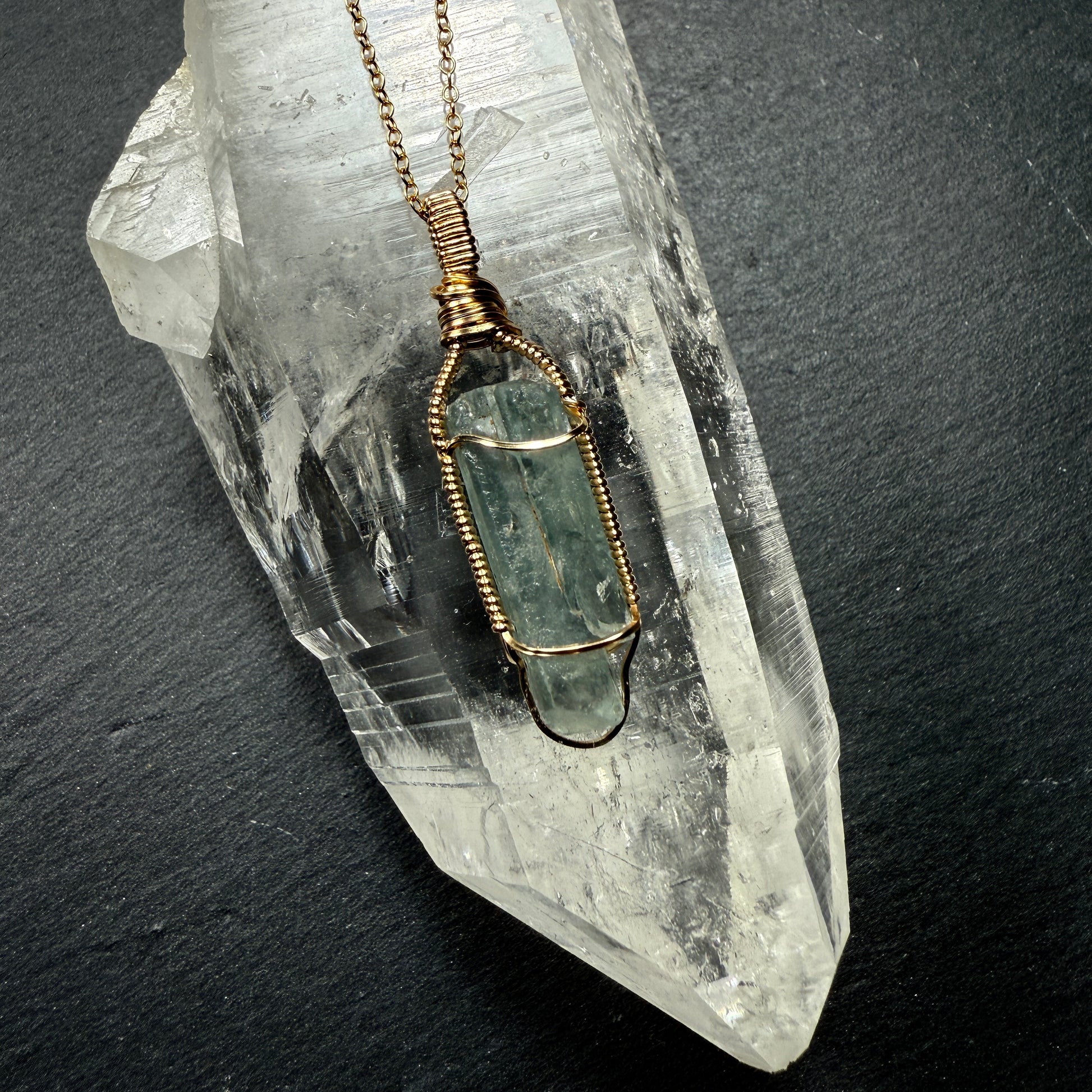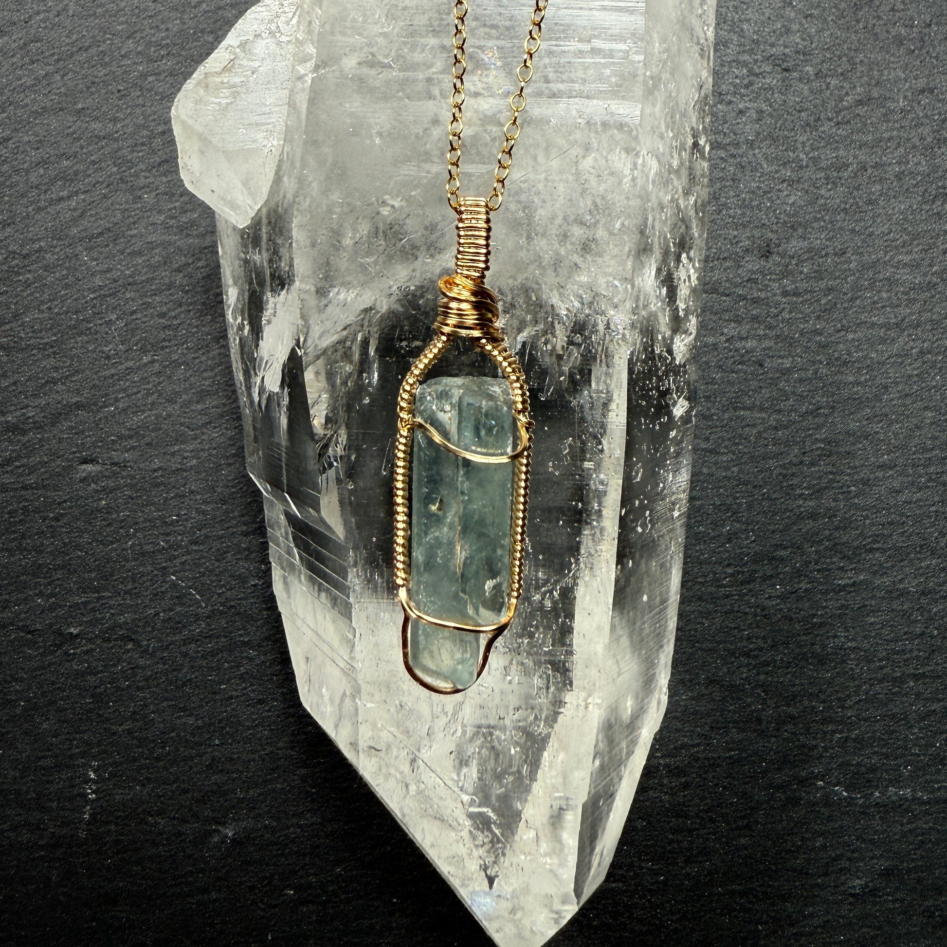 Rare Blue Barite crystal handmade pendant in 14k gold filled wire.