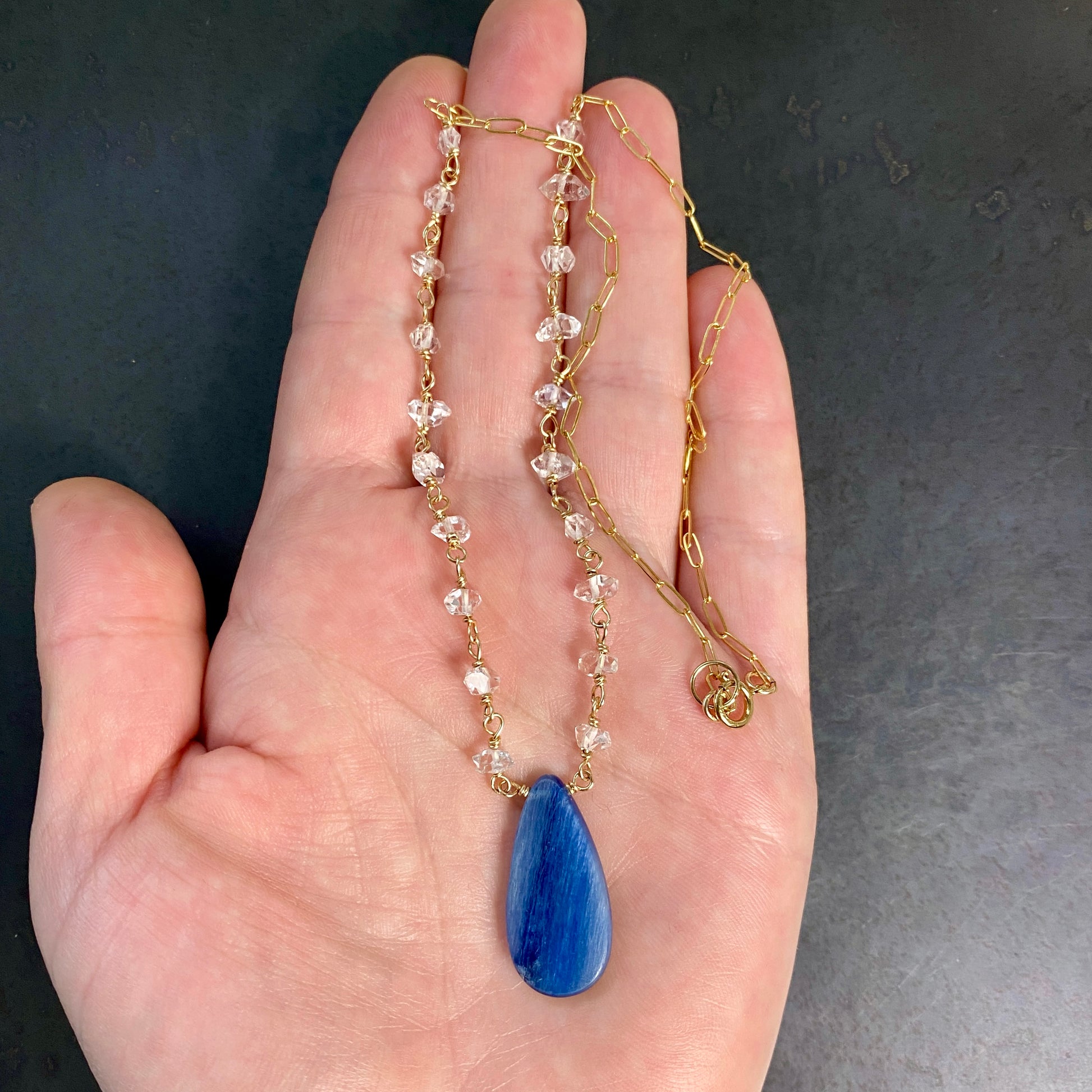 Blue Kyanite and Herkimer Diamond Quartz crystal necklace with 14k gold filled chain and clasp.
