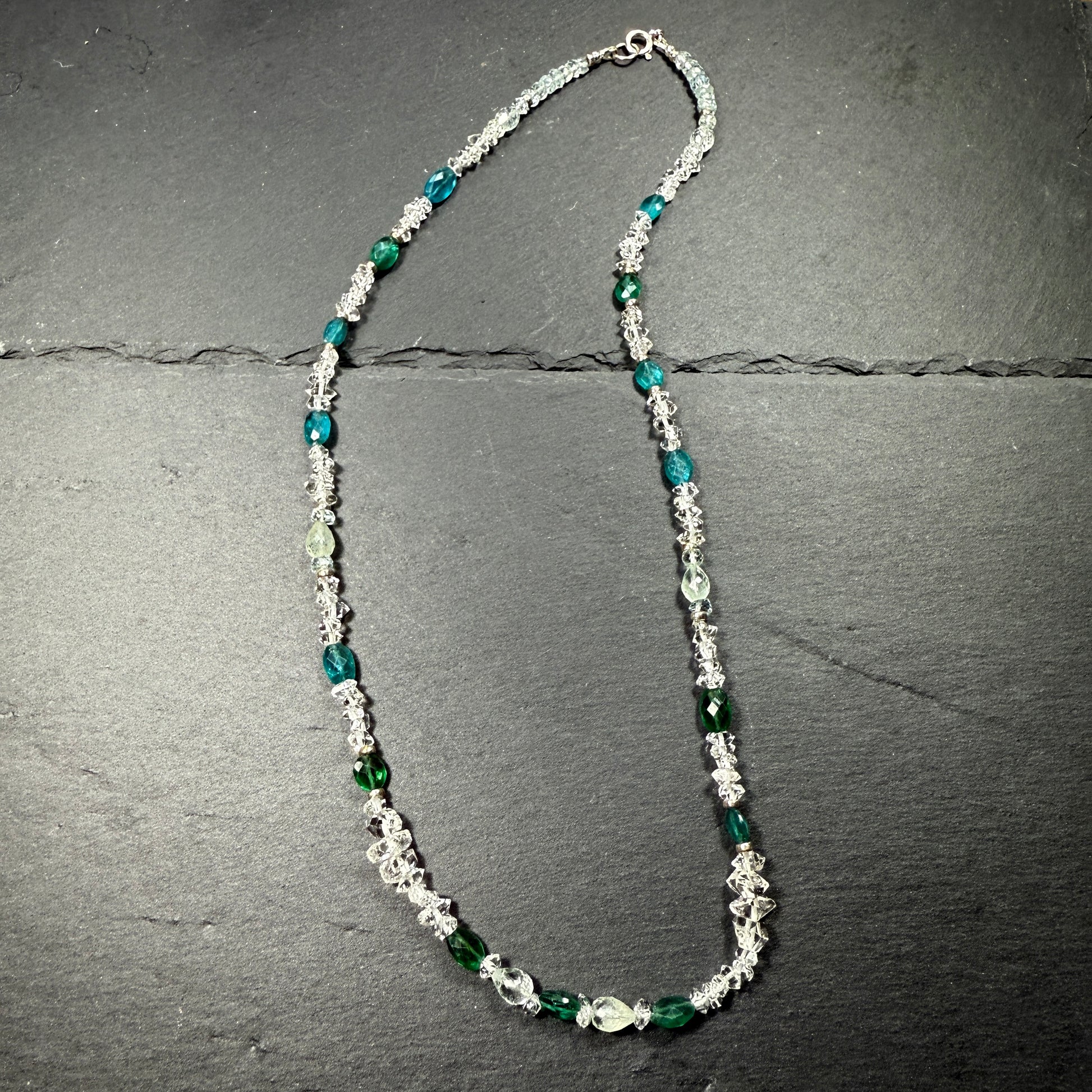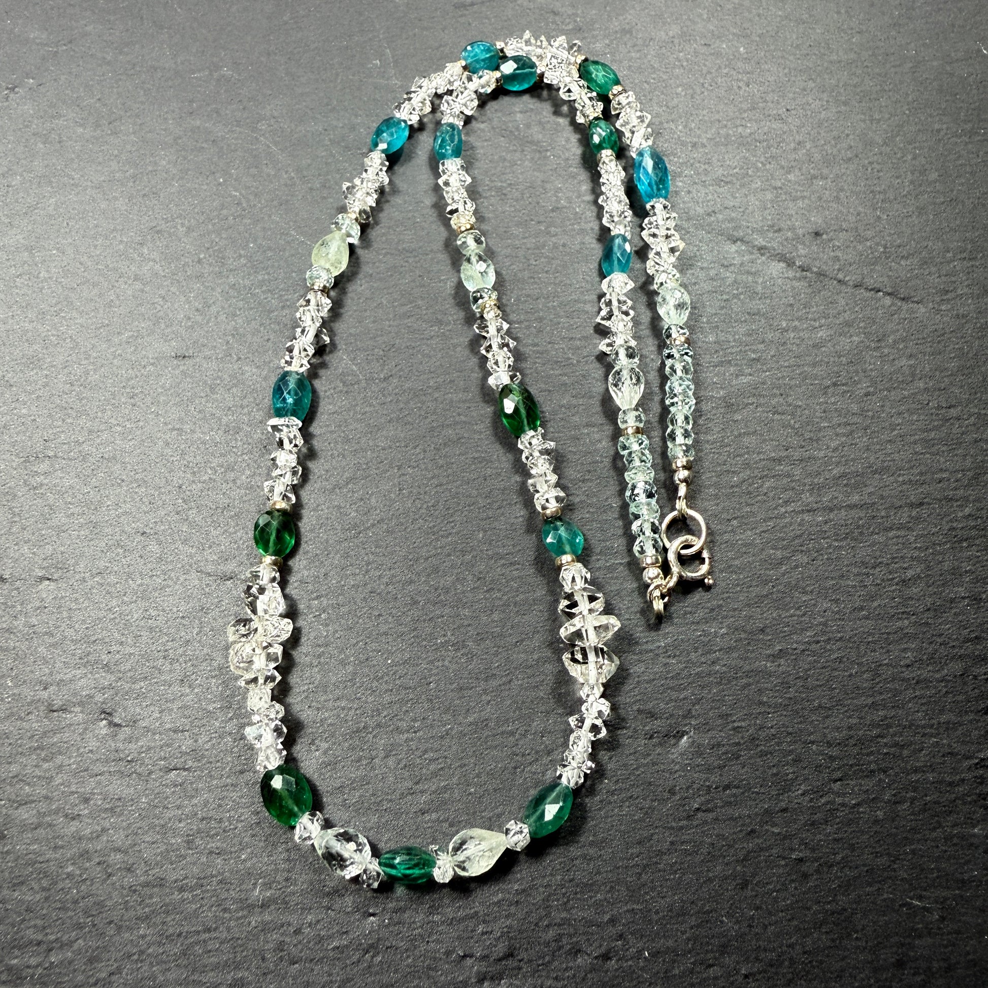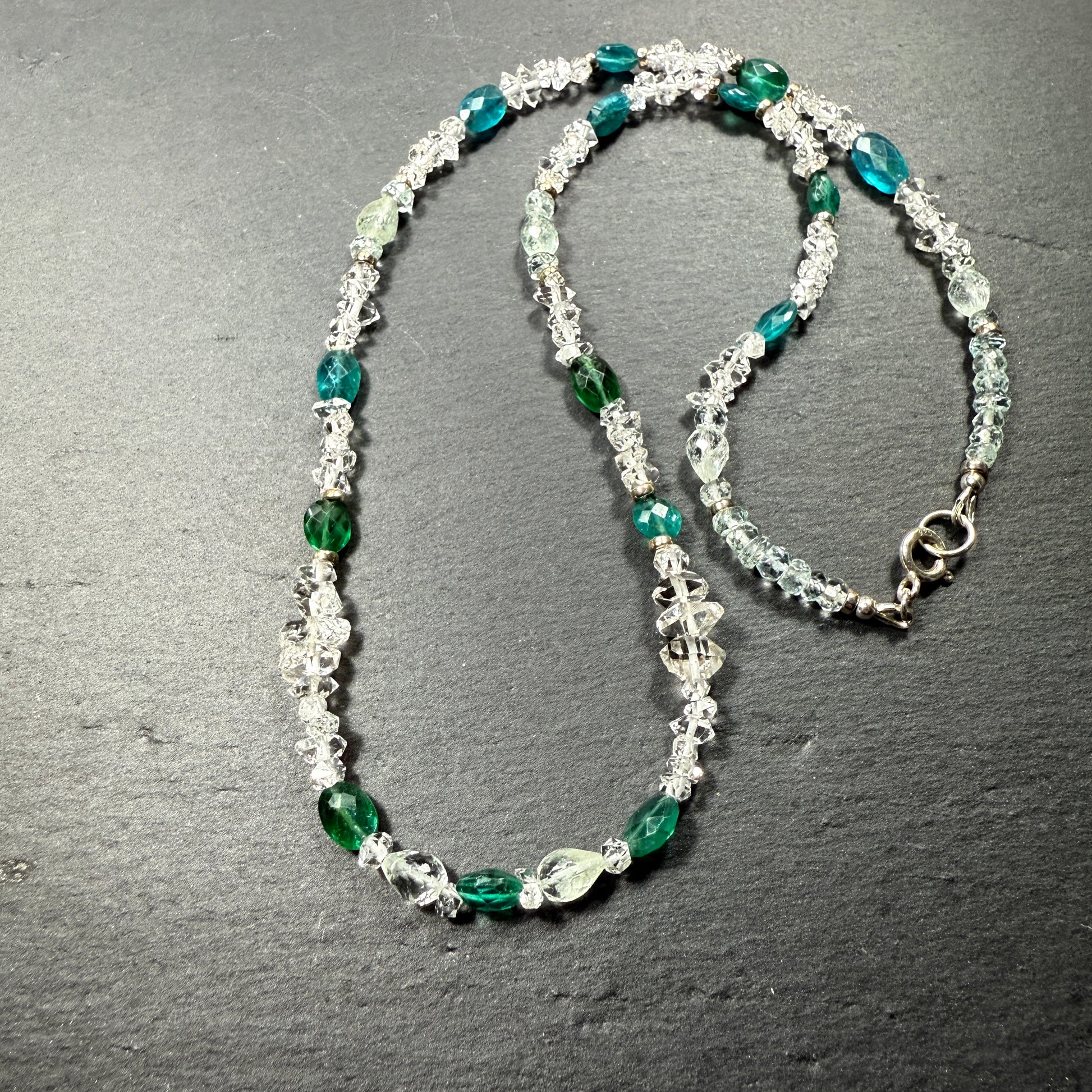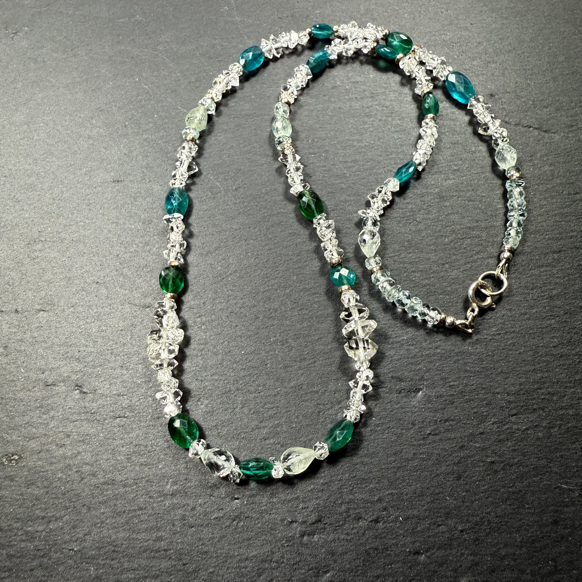 This Gemstone Necklace features faceted Blue Apatite, raw Double Terminated Clear Quartz crystals and faceted Aquamarine beads with sterling silver.