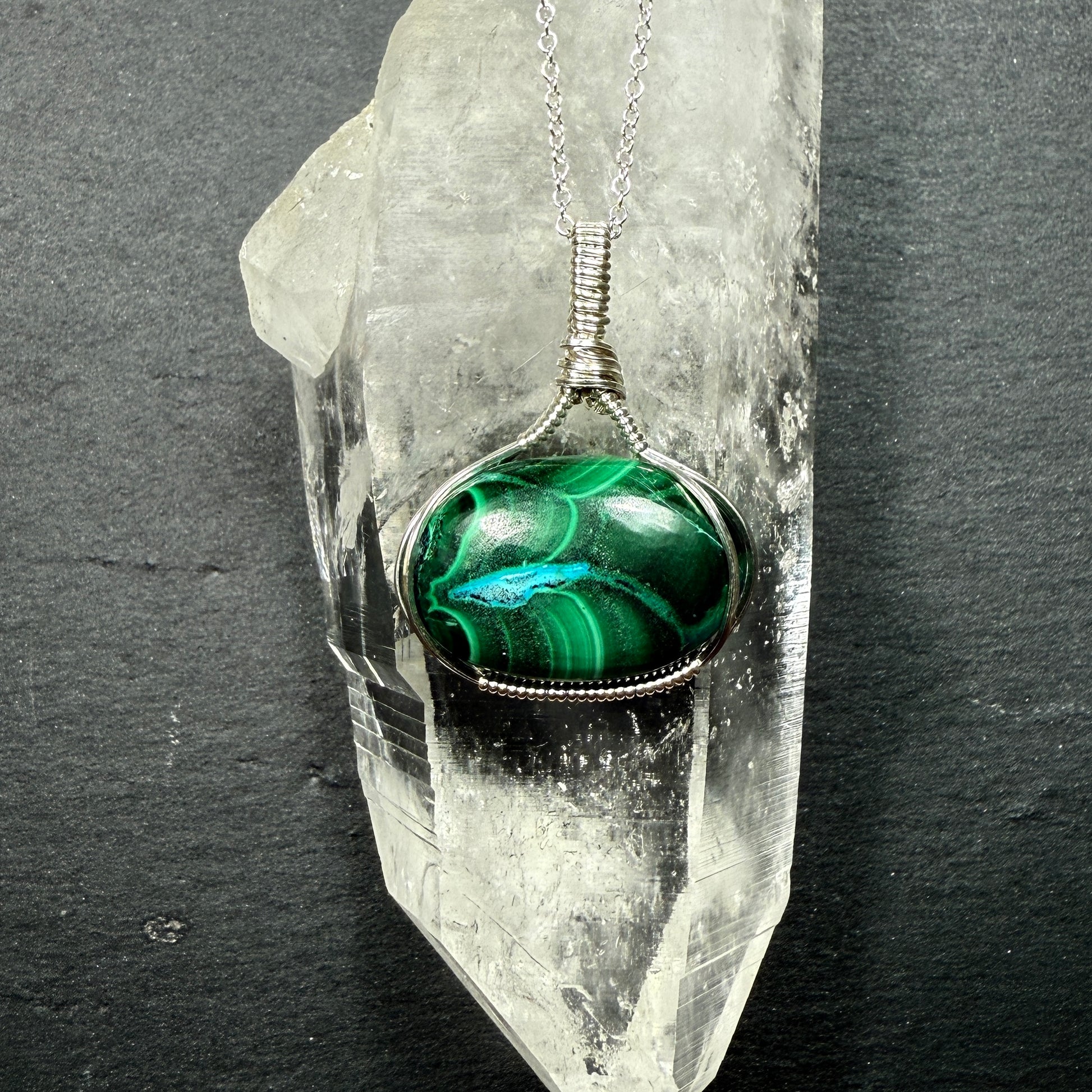 Natural Malachite with Chrysocolla handmade pendant in .925 sterling silver wire.