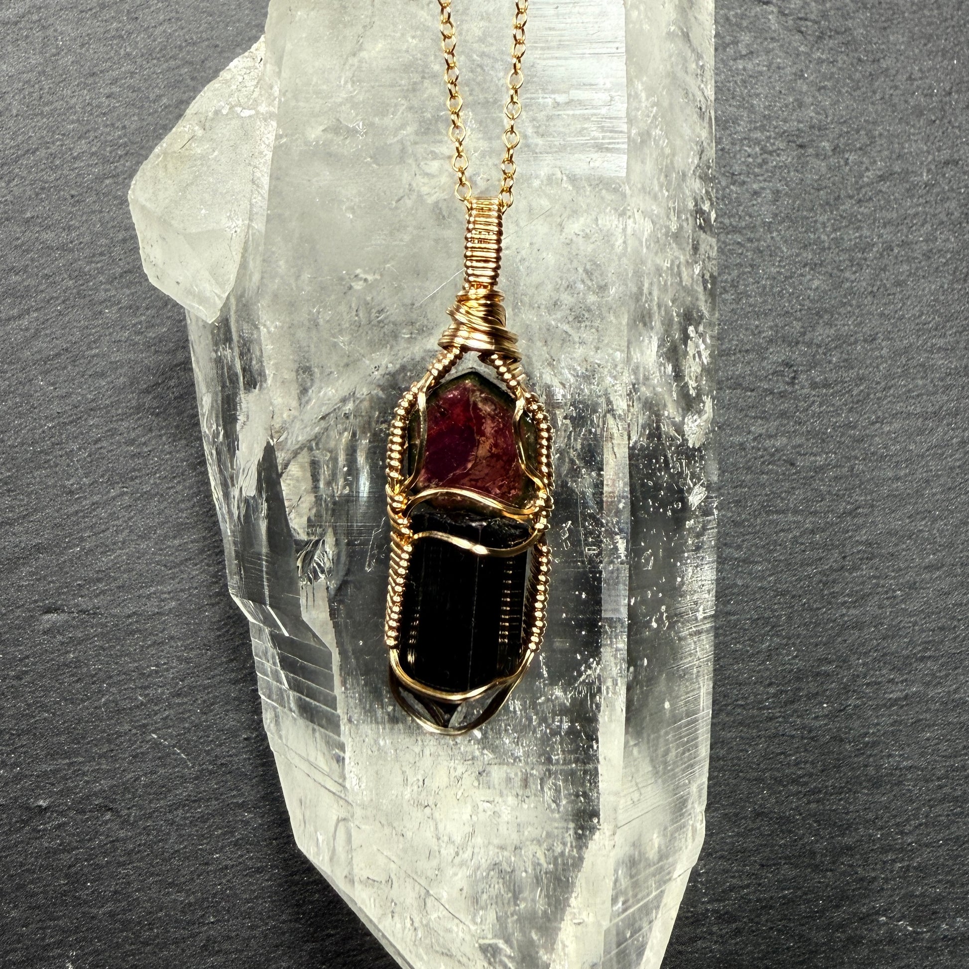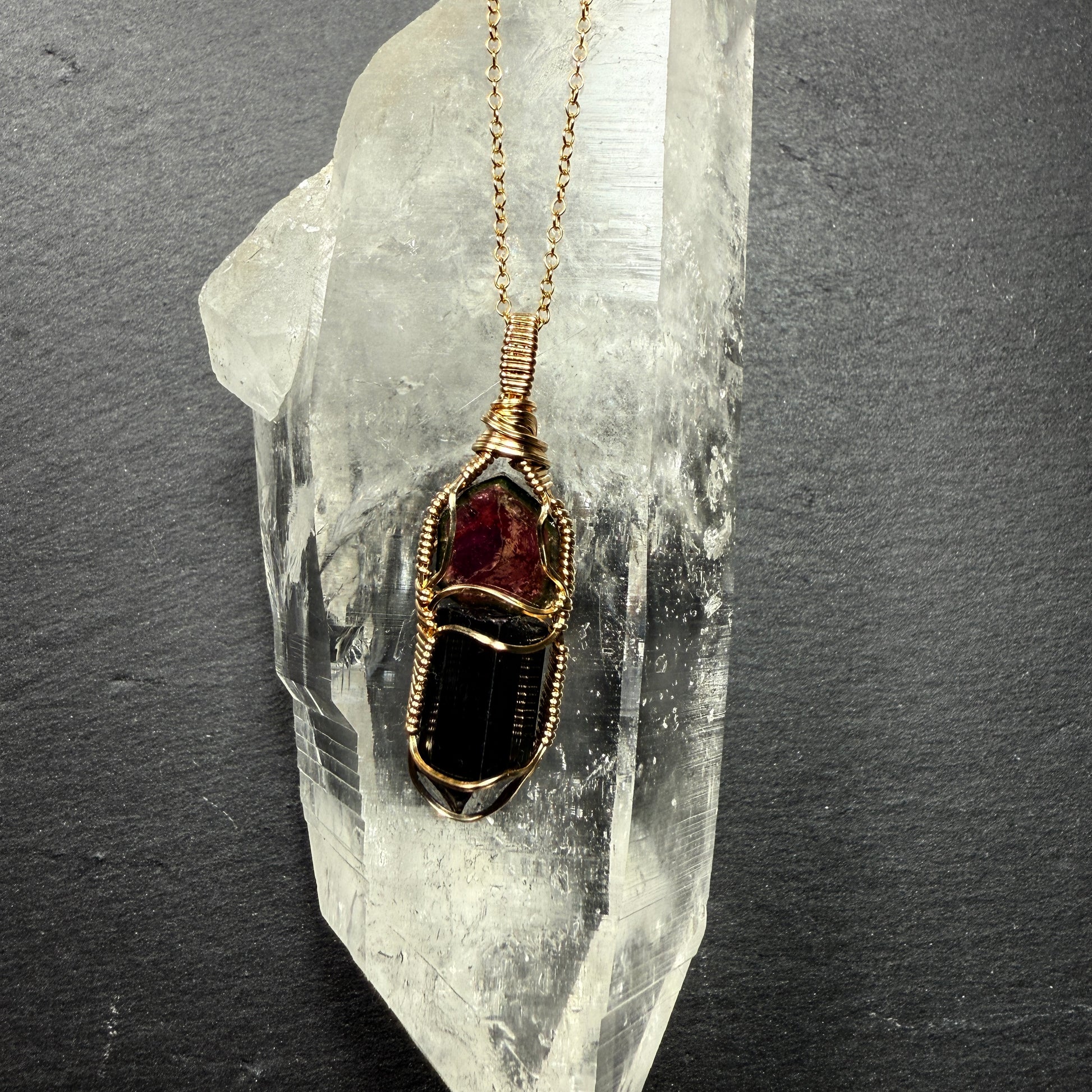 Natural Watermelon Tourmaline slice and raw Black Tourmaline crystal handmade pendant in 14 gold filled wire.